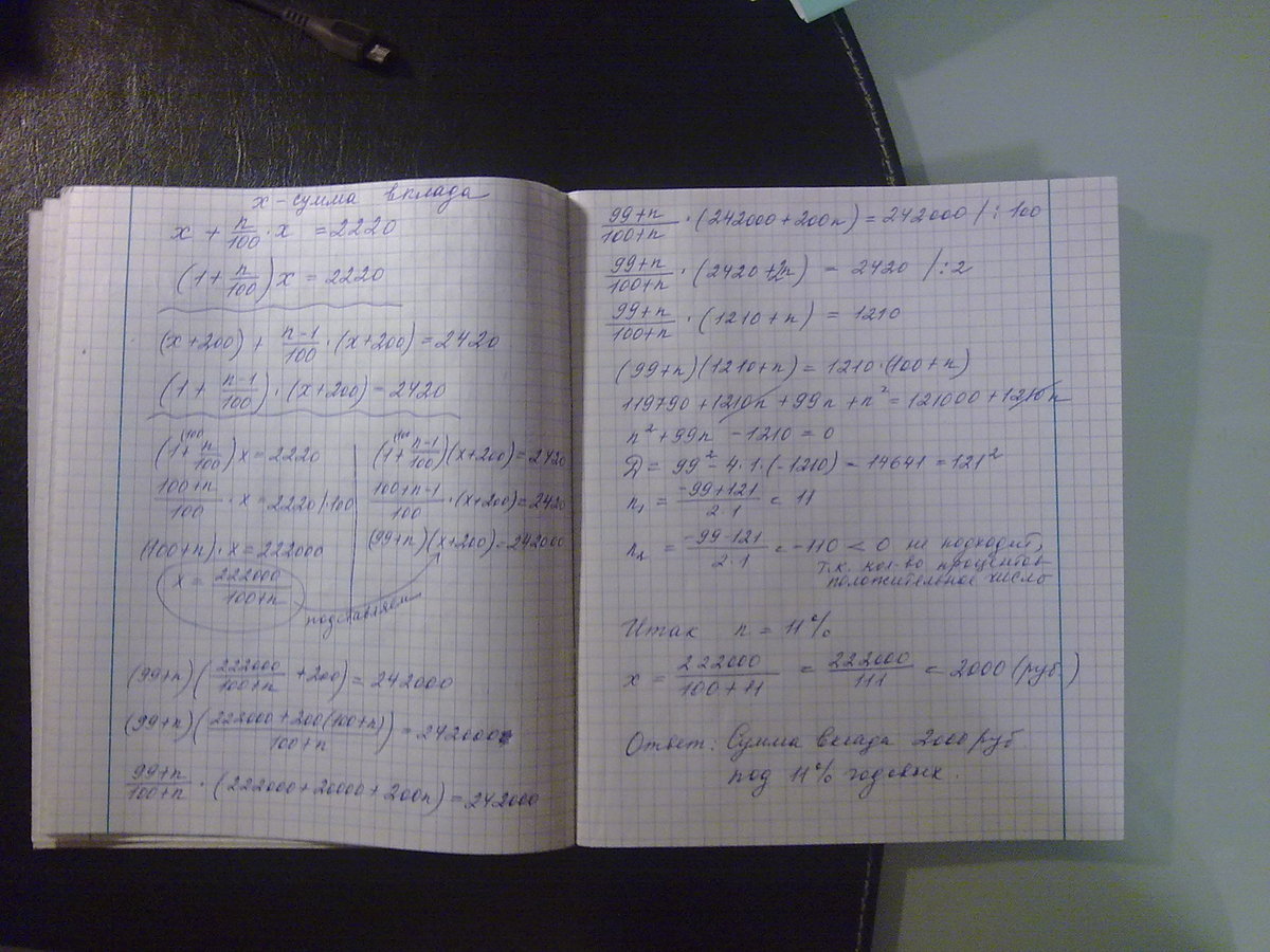 Вкладчик положил деньгив банк и получил через год 2220р. Если бы вклад был на 200р. больше, а банк выплачивал на 1% меньше, то вкладчик получил бы 2420 р. Какой процент выплачивал банк ежегодно?
