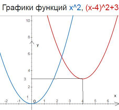 у=(х-4)²+3 получается из графика функции у=х² сдвигом на 4 единицы вправо и на 3 вверх