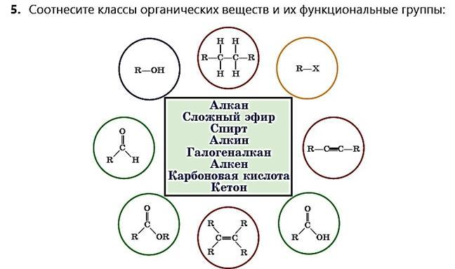 Алкан, галагеналкан, алкин, карбоновая кислота, алкен, сложный эфир, кетон, спирт