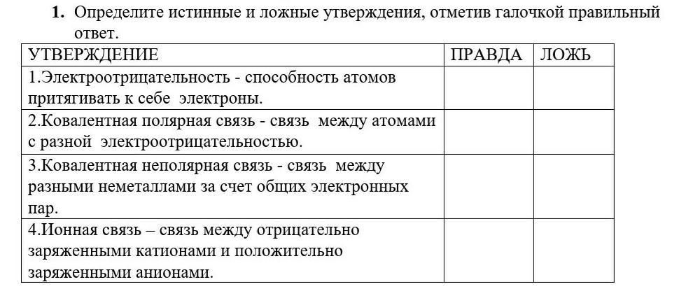 1. Определите истинные и ложные утверждения, отметив галочкой правильный ответ.
