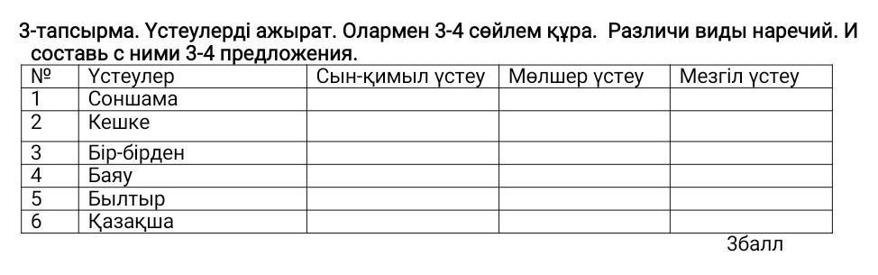 3-тапсырма. Үстеулерді ажырат. Олармен 3-4 сөйлем құра. Различи виды наречий. И составь с ними 3-4 предложения.