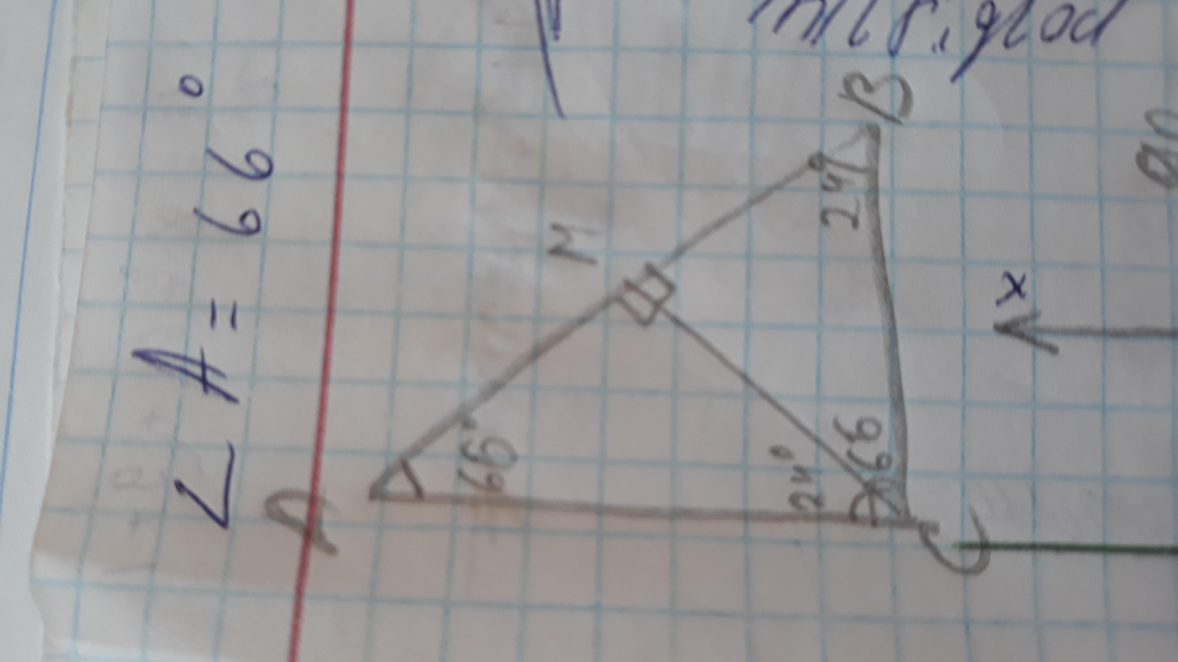 Кут між висотою CM і катетом CA прямокутного трикутника ABC ( < C=90 ) дорівнює 24 градуси. знайдіть гострі кути трикутника АВС.