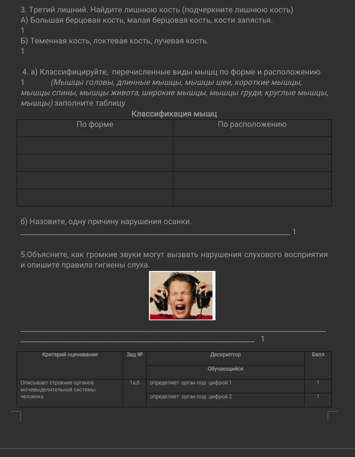 4) а) по форме: длинные мышцы, короткие мышцы,широкие мышцы, круглые мышцы. По расположению всё оставшееся; б) высокий стул, низкая парта в следствии чего человек сильно сутулится. Развивается сколиоз