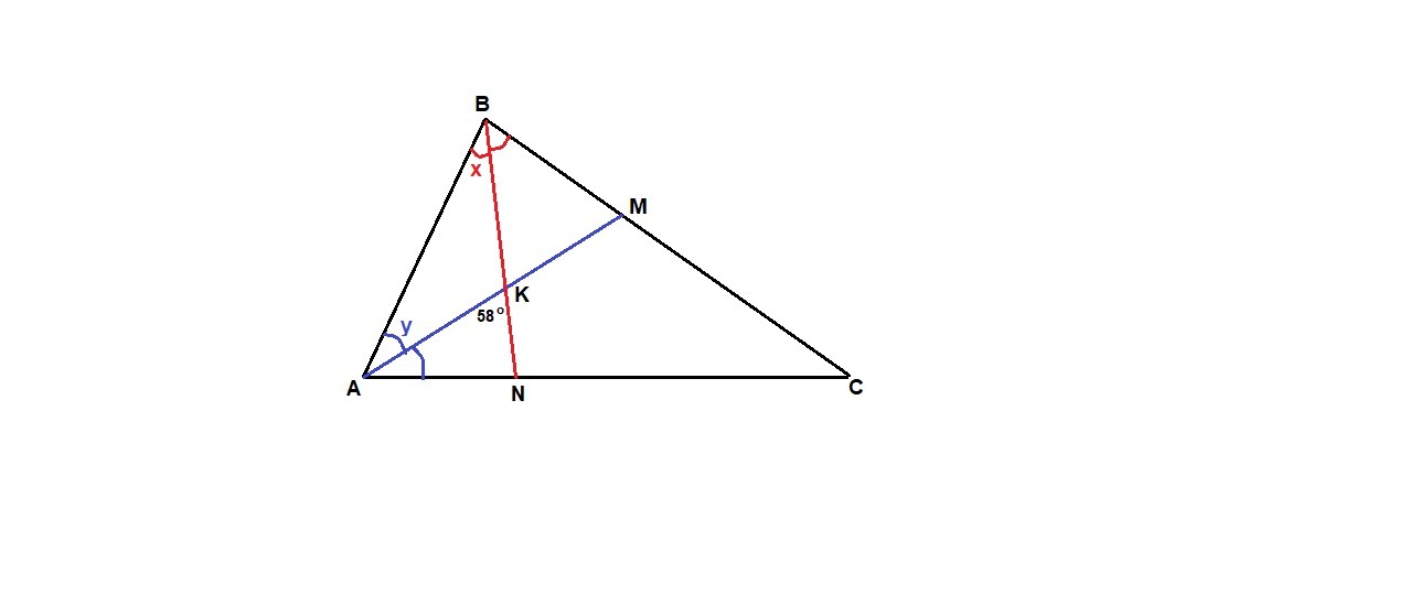 в треугольнике ABC проведены биссектрисы AM и BN, пересекающиеся в точке К. угол AKN= 58 градусов. найти угол ACB