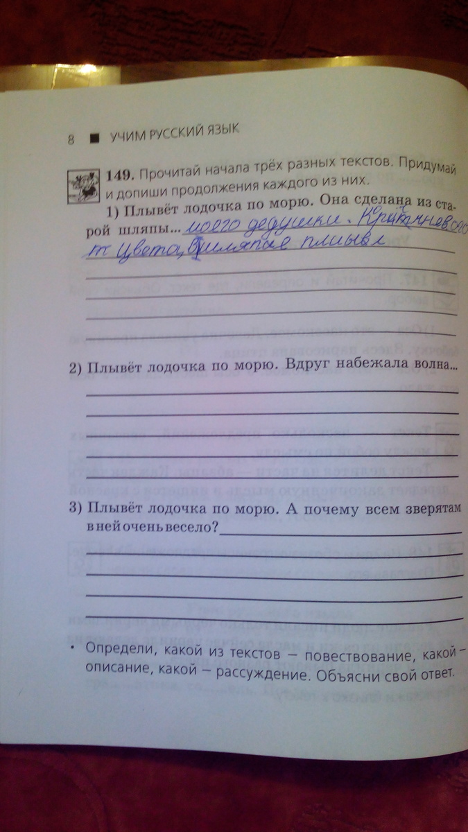 Плывет лодочка по морю.Она сделана из старой шляпы...рыбака.Который любил выходить в море под парусом.Я всегда махал ему с пристани и думал:" когда же он вернется в следующий раз?"Как то утром когда он приплыл с рыбалки он привез мне ракушки,жемчужин и немного рыбы.Я был очень рад.