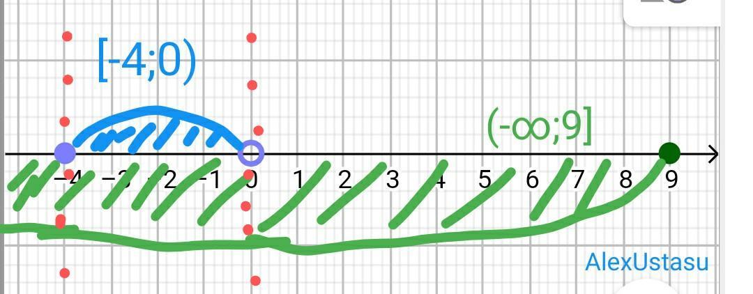 Изобразите на координатной прямой Запишите пересечение и Объединение числовых промежутков (-4;0) и (-∞;9)