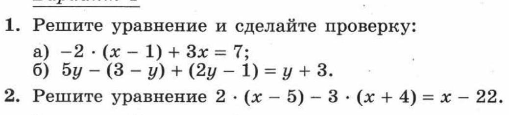 -8+15=7 7=7 ВЕРНО б) 5у-3+у+2у-1=у+3 7у=7 у=1 ПРОВЕРКА: