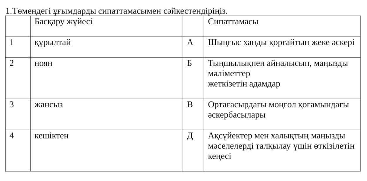 Көмектесіндерш қазақстан тарихы төмендегі ұғымдарды сипаттамасымен сәйкестендіріңіз