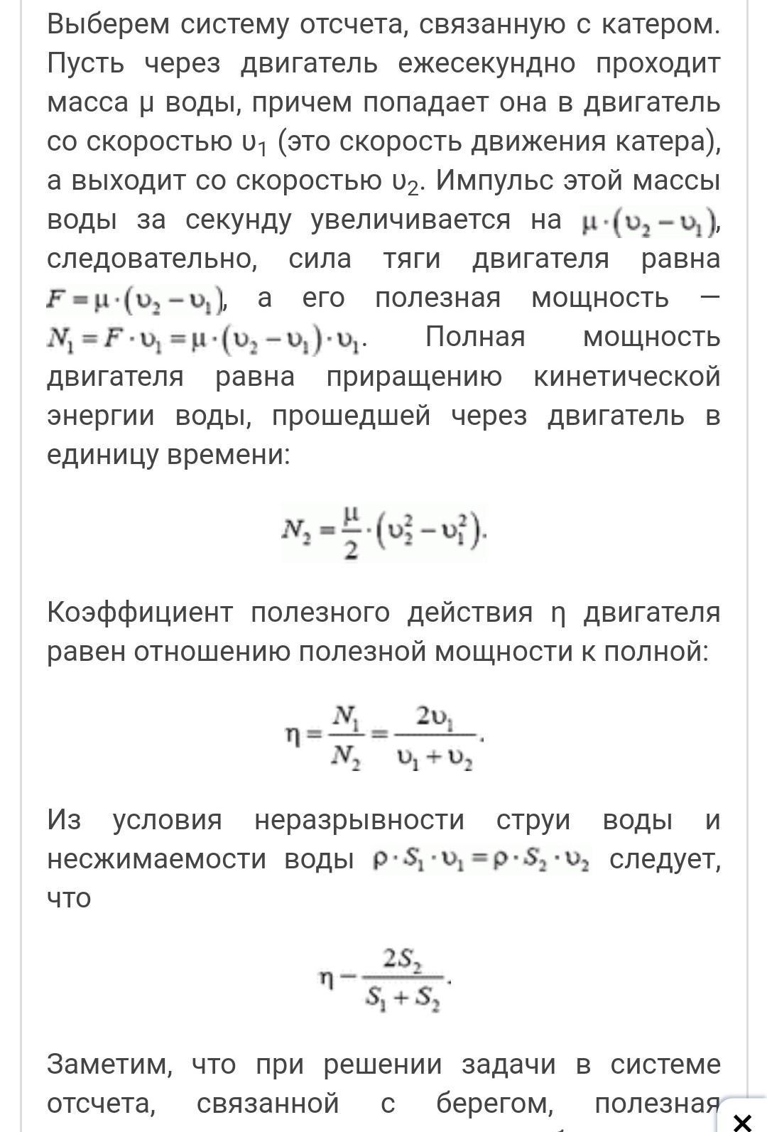 Найти коэффициент полезного действия водометного двигателя реактивного катера, движущегося с постоянной скоростью, считая известными площадь входного отверстия S1 и выходного S2 Указание. Считать, что в водометный двигатель вода поступает через входное отверстие в носовой части катера благодаря его движению навстречу покоящейся относительно берега воде (поэтому входит вода в катер со скоростью v1, равной скорости катера относительно берега); затем вода выбрасывается назад через выходное отверстие с большей скоростью v2 (это скорость относительно катера). Пренебречь 3-мерностью движения воды. Для нахождения силы тяги F, входящей в выражение для полезной мощности двигателя Pполезн=Fv1 рассмотреть ежесекундное изменение импульса массы воды, поступающей в двигатель в единицу времени. Полную мощность Pполн считать равной приращению кинетической энергии воды, проходящей через двигатель ежесекундно. Учесть соотношение S1v1=S2v2, считая течение воды в двигателе неразрывным.