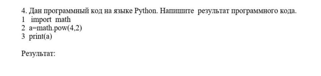 СРОЧНО АЫААЫАЫА 4. Дан программный код на языке Python. Напишите результат программного кода.