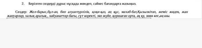 Сөздер: Жол-барыс=Жолбарыс, бұл-ан=бұлан, био алуантүрлік=био-алуантүрлік, қоқи-қаз=қоқиқаз, аң құс=аң-құс, махаб-бат=махаббат, Қызылкытап=Қызыл кітап, жеміс жидек=жеміс-жидек, жан жануарлар=жан-жануарлар, халық аралық=халықаралық, хайуанаттар-бағы= хайуанаттар бағы, сүт қоректі=сүтқоректі, эко жүйе= эко-жүйе, қоршаған орта=қоршаған-орта, ақ қу=аққу, зиян кес=зиянкес, аң шы=аңшы.
