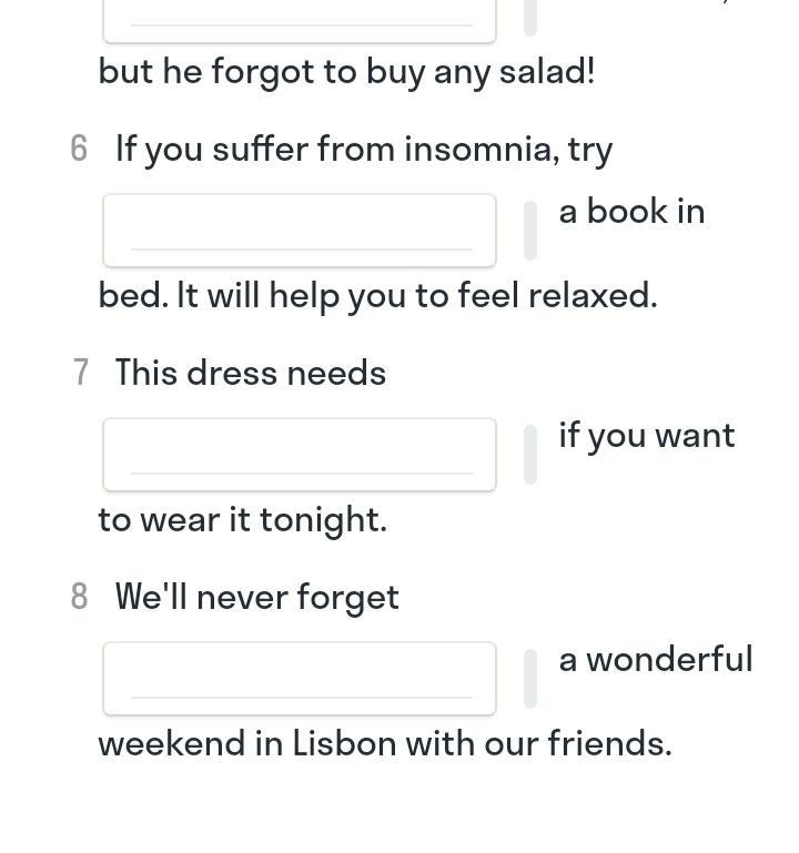 2 climbing 3 to call 4 to send 5 to buy 6 to read 7 ironing 8 spending