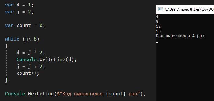 Цикл выполняется пока j <= 8, изначально j = 2 и каждый раз j увеличивается на 2, значит цикл выполнится : (8-2)/2 = 6/2 = 3 раза