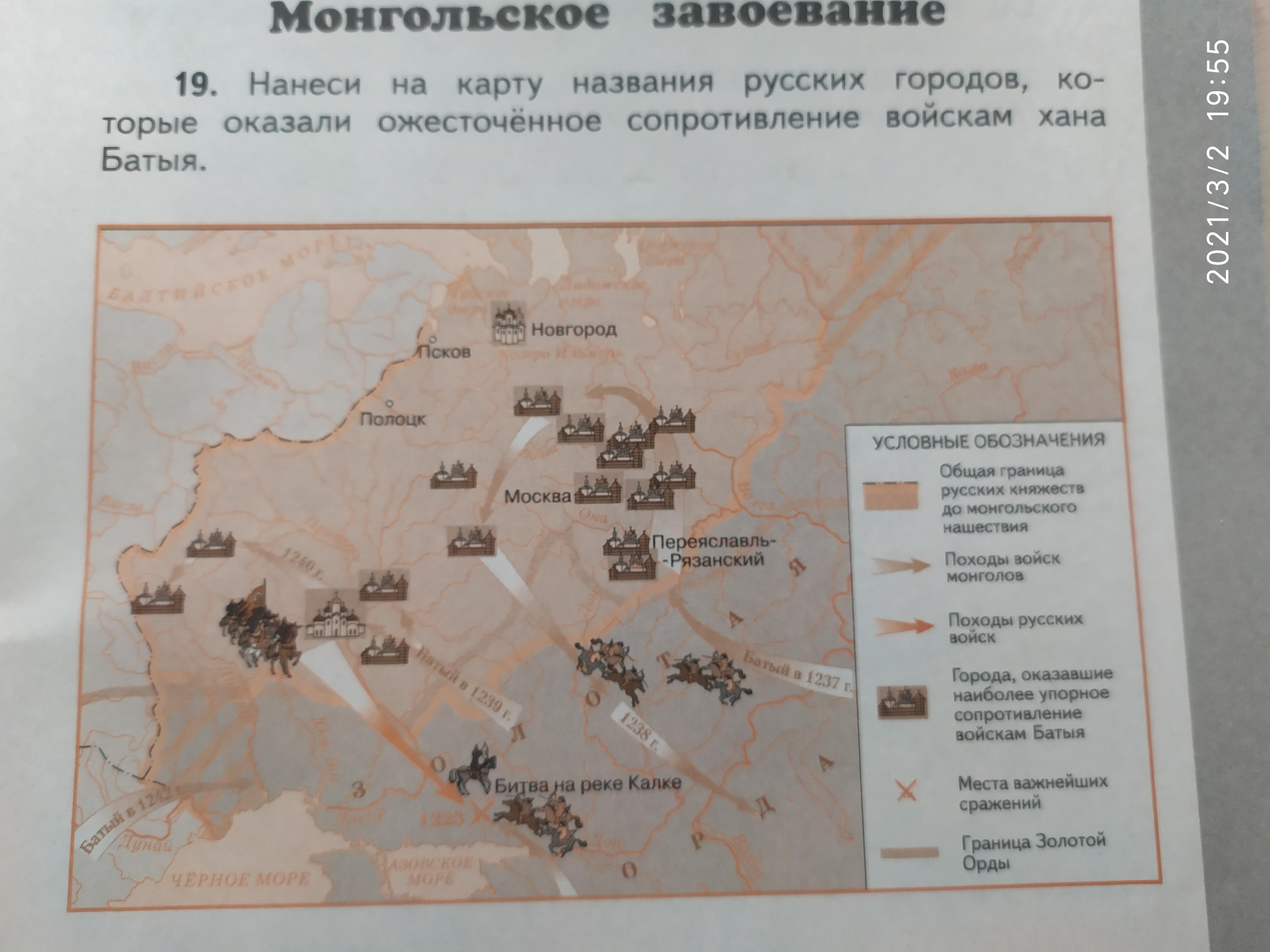 Нанеси на карту названия русских городов, которые оказали ожесточённое сопротивление войскам хана Батыя.