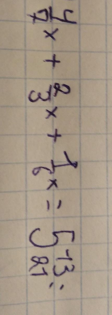 А словами четыре седьмых x +две третьих x + одна шестая x =пять целых три двадцать первых