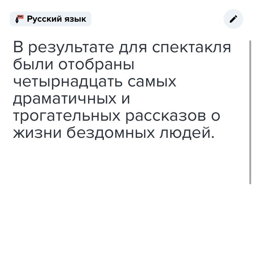 В результате для спектакля были отобраны четырнадцать самых драматичных и трогательных рассказов о жизни бездомных людей.