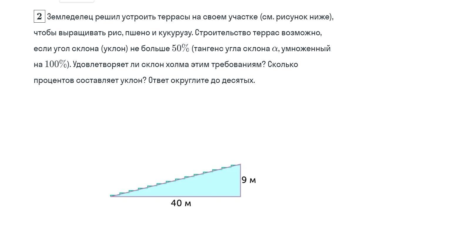 Тангенс угла склона = 9 : 40 ≈ 0,225