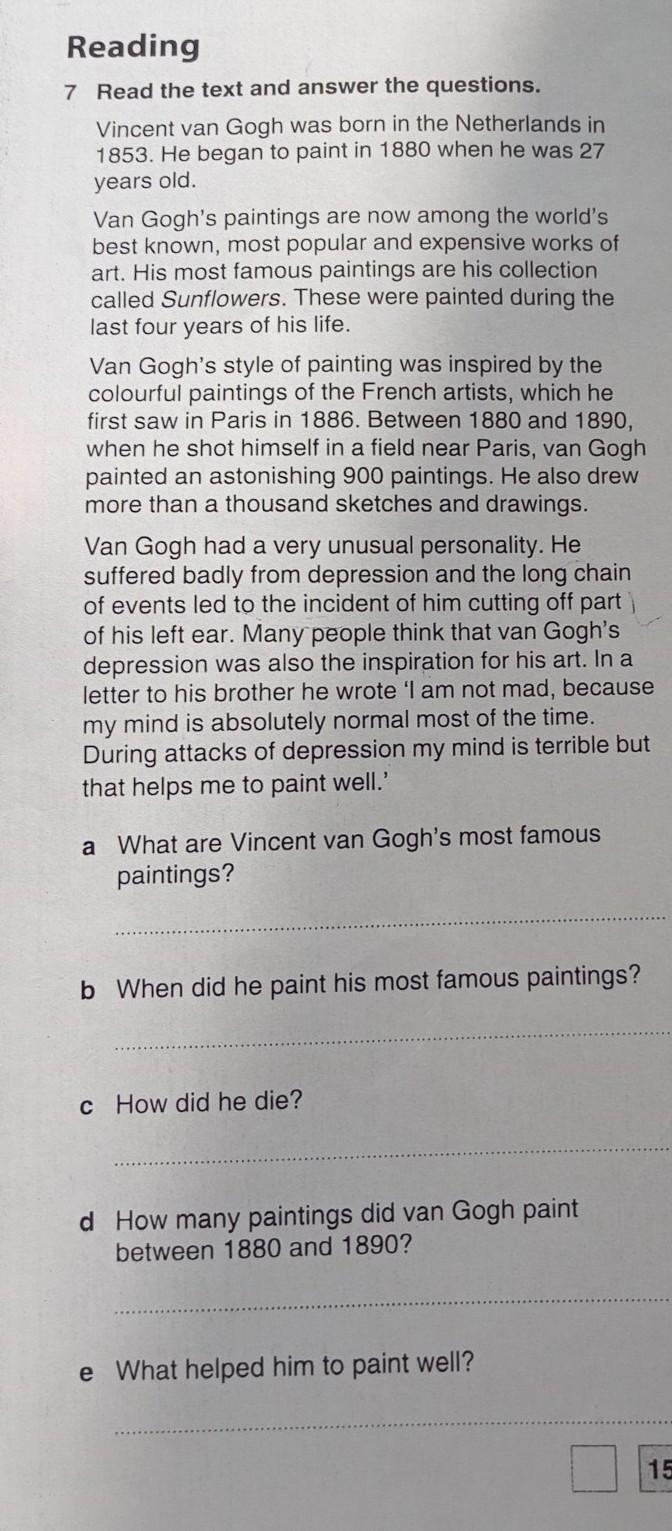 Вас попросили прочитать текст о известном писателе Vincent Van Gogh и ответить на вопросы.