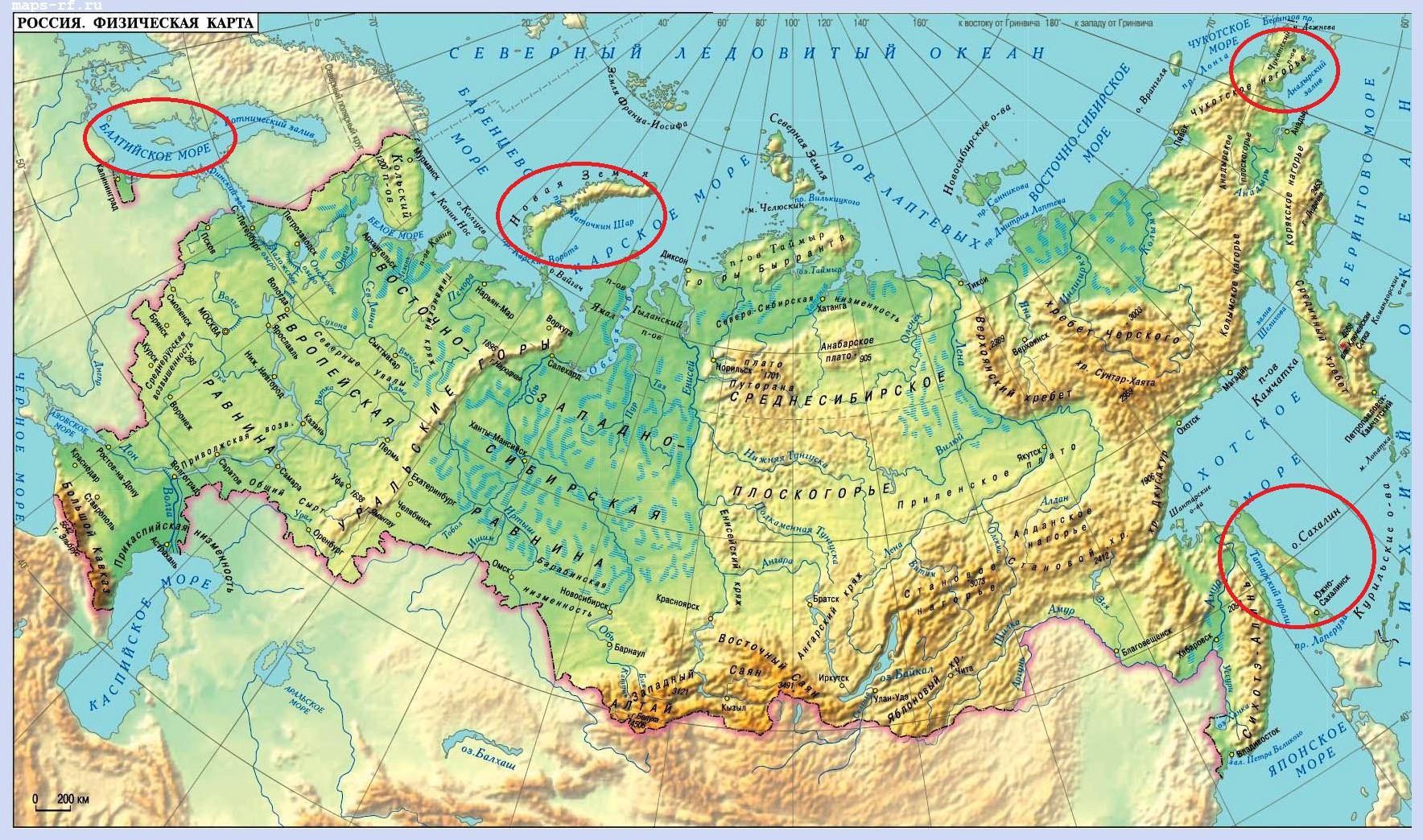 Географические объекты, которые перечислены выше, выделены на физической карте России.