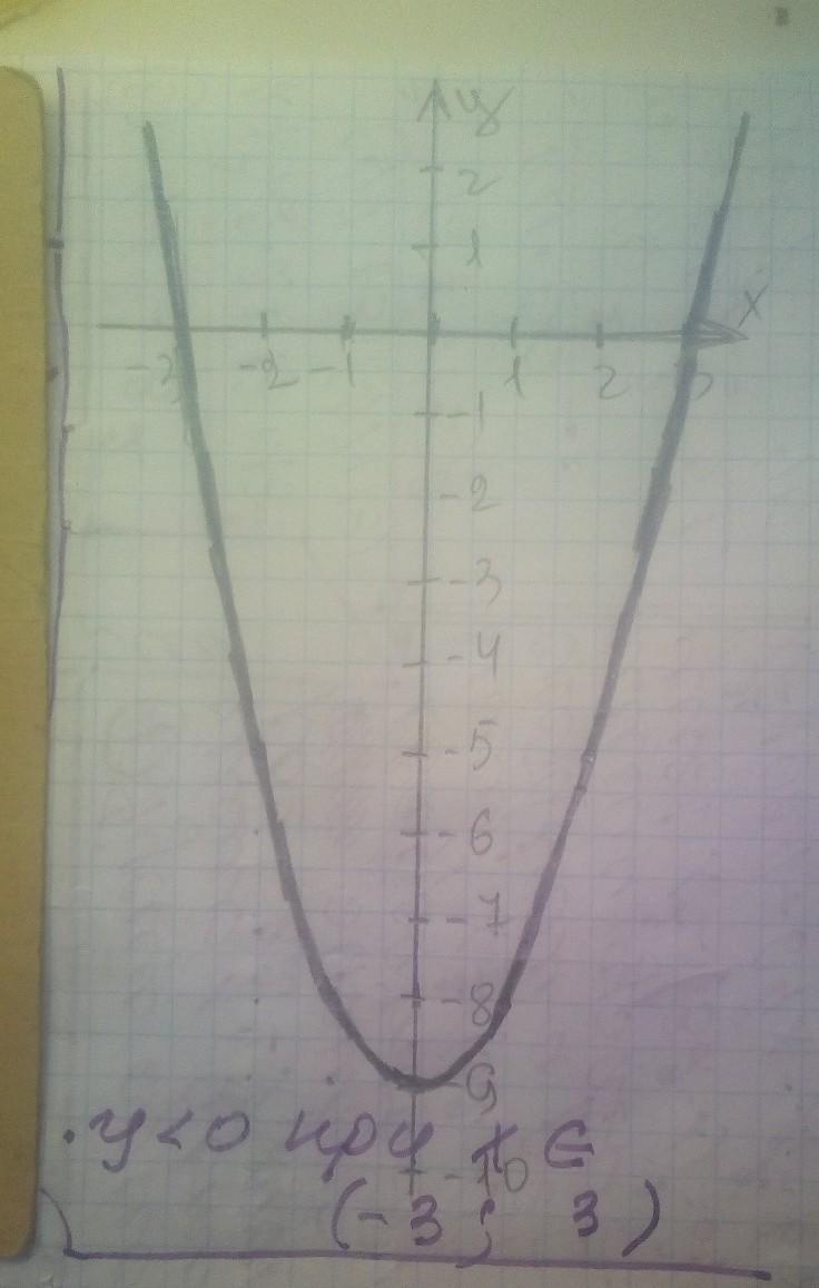 Построй те график квадратичной функции y=x^2-9 и найдите значения аргумента, при которых функция принимает отрицательные значения?