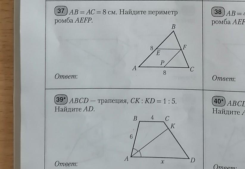 Однако треугольник ВСМ тоже равнобедренный (подобен АDМ по двум соответственным углам) Зачит ВМ=4 . АМ=6+4=10