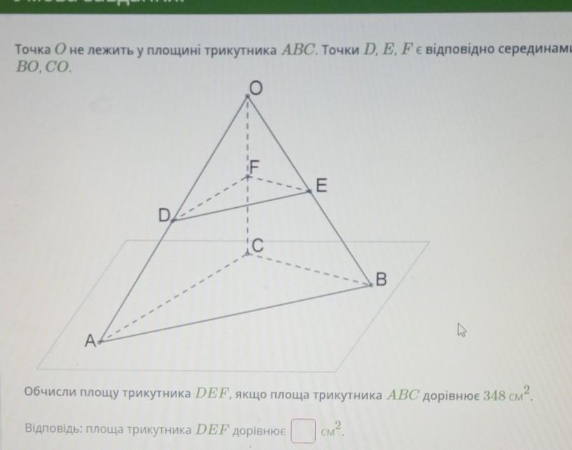 значит треугольник dfe подобен треугольнику acb значит отношение их площадей равно квадрату коэффициента подобия значит площадь def = площадь abc / 4 = 348 / 4 = 87