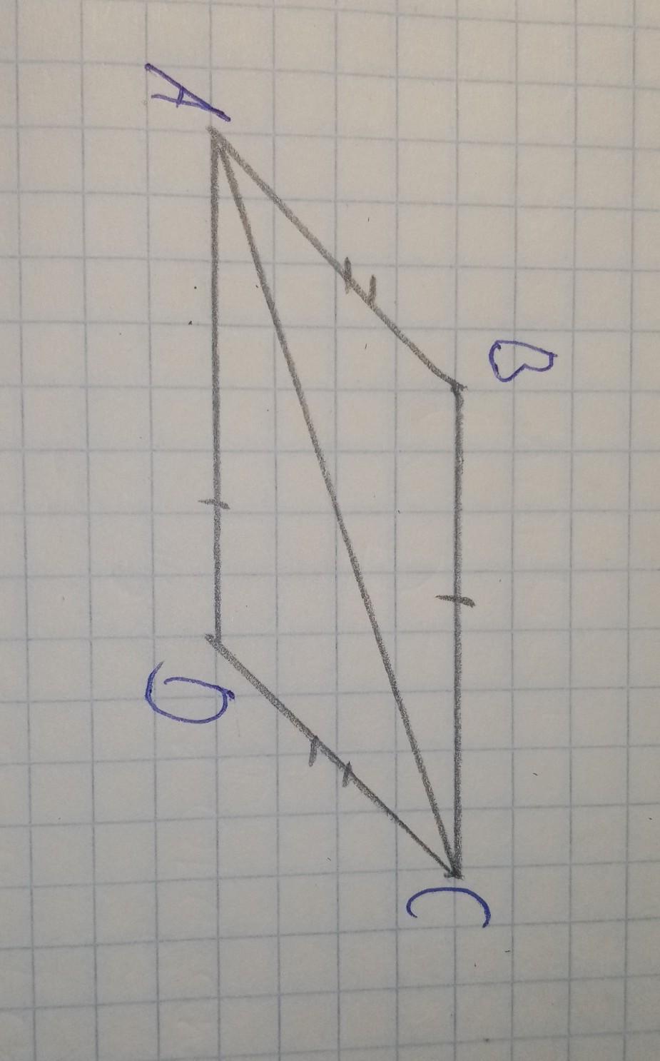 Так как АВ=DC, AD=CB и АC- общая, то по 3-му признаку равенства треугольников ΔАВС=ΔCDA (Если три стороны одного треугольника соответственно равны трем сторонам другого треугольника, то такие треугольники равны).