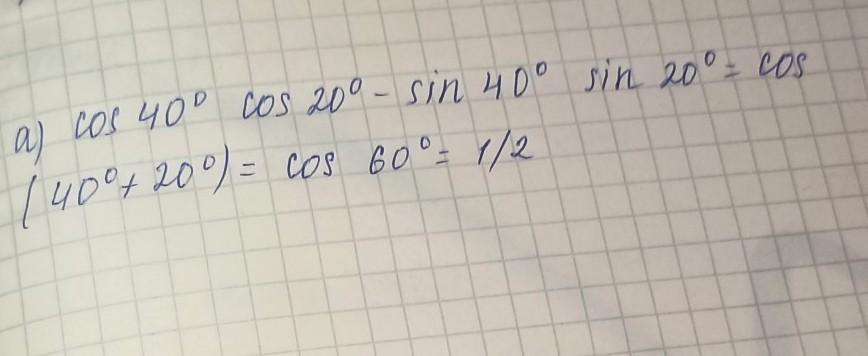 а)cos 40° cos 20°-sin 40° sin 20°=cos(40°+20°)= cos 60°= 1/2.
