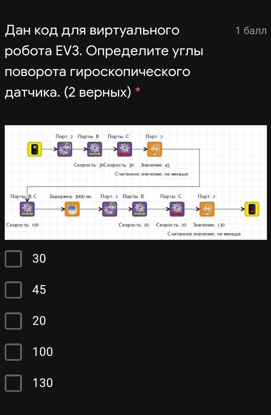 Дан код для виртуального робота EV3. Определите углы поворота гироскопического датчика. (2 верных) *
