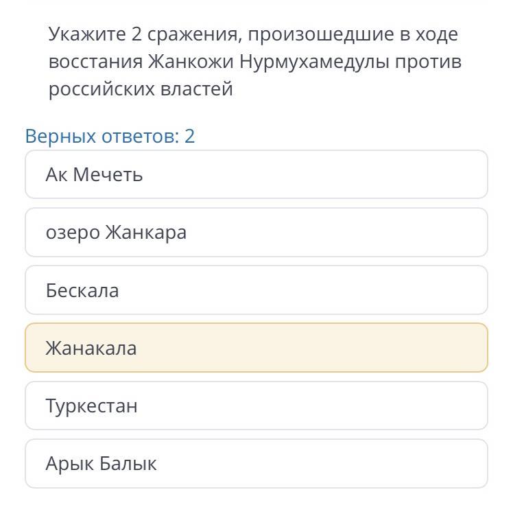 Укажите 2 сражения, произошедшие в ходе восстания Жанкожи Нурмухамедулы против российских властей