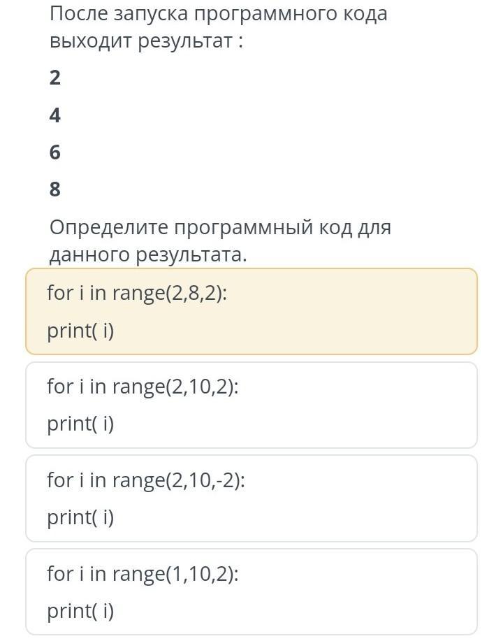после запуска программного кода выходит результат:2 4 6 8 определите программный код для данного результата