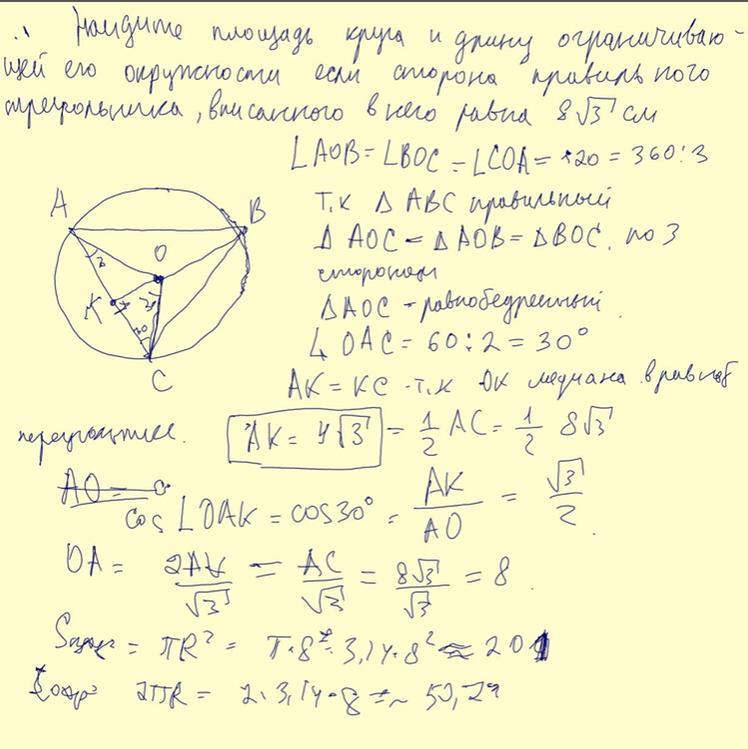 Найдите площадь круга и длину ограничивающей окружности,если сторона правильного треугольника,вписанного в него8√3