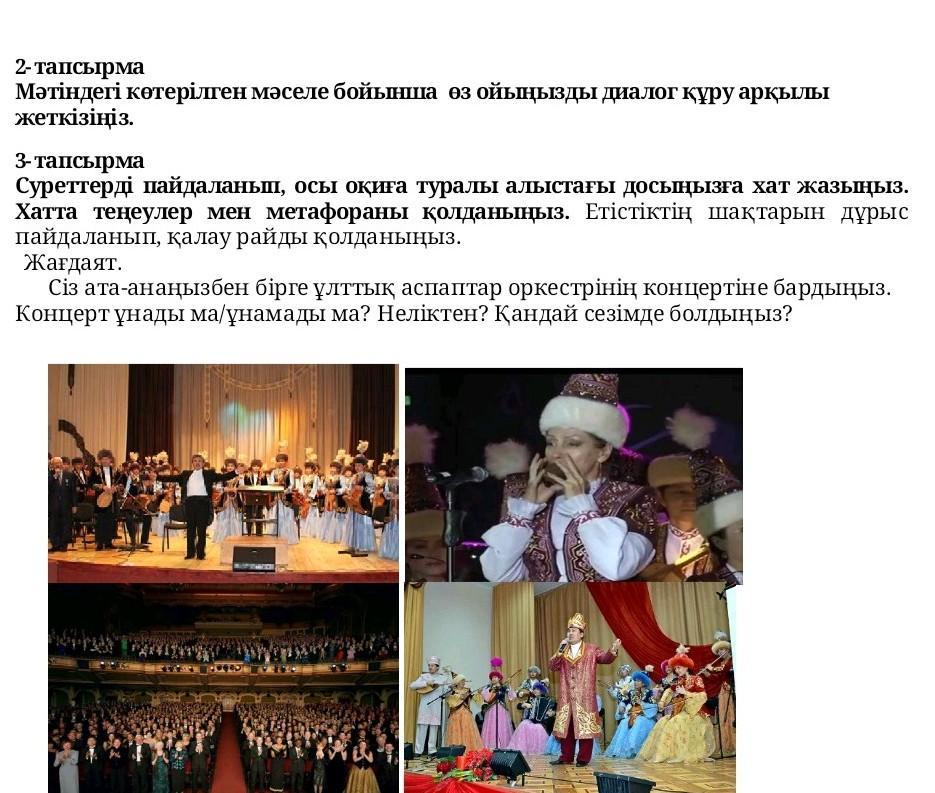 Сәлем, досым! Мен бүгін ата-анаммен ұлттық аспаптар оркестрінің концертіне бардық. Осы жерге тез келгім келген. Концерт өте керемет өтті. Ұлттық аспаптардың әдемі үні құлаққа жағымды естілді. Сол дыбыстарды ести бергім келді. Аспап дыбыстары мұхит толқындарындай, ормандағы бұлбұл құстың үніңдей әсем болды. Сол аспапта ойнаған адамдар да керемет. Күйдің майың тамызып тұрып, беріліп ойнады. Келесі жолы екеуміз бірге барамыз деп ойлаймын.