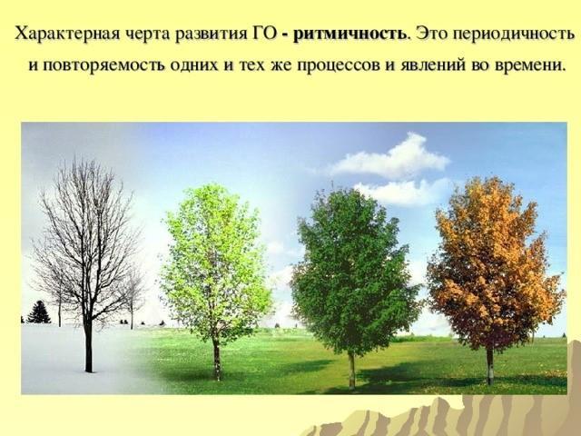 Ритмичность заключается в повторении через определённое время каких-либо циклов природных явлений.Например, смена сезонов года, смена дня и ночи, приливы и отливы.