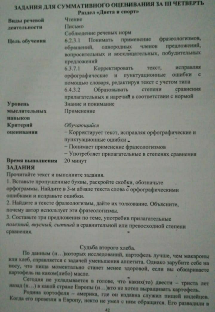 ЗАДАНИЯ Прочитайте текст и выполните задания. 1. Вставьте пропущенные буквы, раскройте скобки, обозначьте орфограммы. Найдите в 3-м абзаце текста слова с орфографическими ошибками и исправьте ошибки. 2. Найдите в тексте фразеологизмы, дайте их толкование. Объясните, почему автор использует эти фразеологизмы. 3. Составьте три предложения по теме, употребив прилагательные полезный, вкусный, сытный в сравнительной или превосходной степени сравнения. Судьба второго хлеба. По данным (H,... )которых исследования, картофель лучше, чем макароны или хлеб, справляется с задачей уменьшения аппетита. Однако зарубите себе на носу, что пиша моментально станет менее здоровой, если вы обжариваете картофель на каком(либо) масле. Сегодня не укладывается в голове, что каких( ro) accm - триста лет н а (i,...) в какой стране Европы (...)кто не хотел выращивать картофель Родина кортофеля x = америка, где он издавна служил пищей индейцев. Когда его превели в Европу, некто не умел с ним обращатся. Его развадили в 42