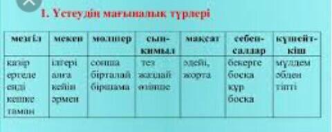 Тапсырма -3 . Үстеулердің мағыналық түрлерін ажыратыңыз . ( 2 ) Бүгін , енді , әрі - бері , ілгері - кейін , қыруар , біршама , қазір , әлгінде , кеше , тез , жылдам , емін - еркін , лезде , осылай , әбден , мүлдем , нағыз , әдейі , амалсыздан ,