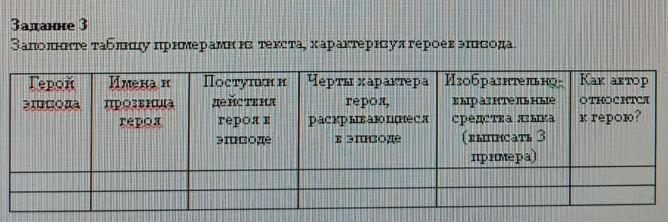 Заполните таблицу примерами текста, характера, героев эписода (помогите люди если не знаете ответ не пишите сразу жалоба и бан)