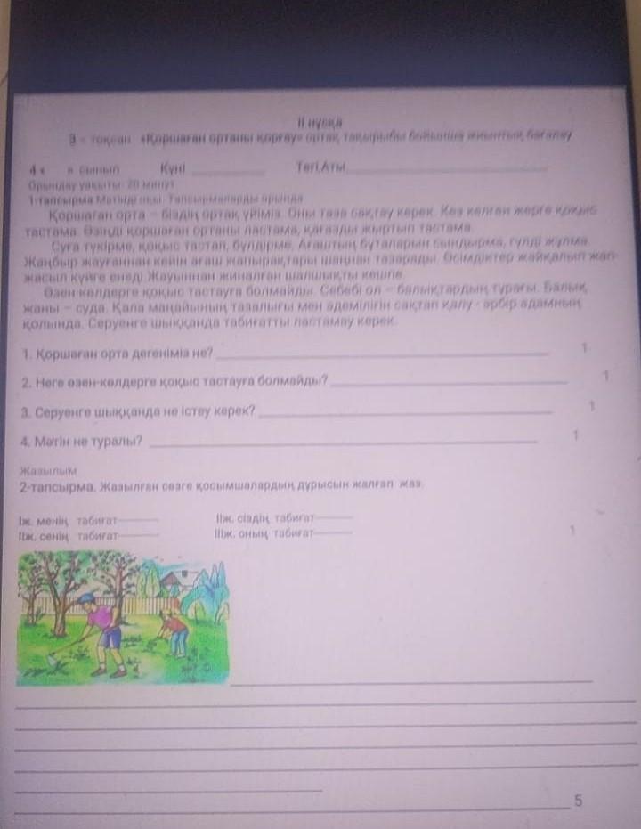 Қоршаған орта – біздің ортақ үйіміз. Оны таза сақтау керек. Кез келген жерге қоқыс тастама. Өзіңді қоршаған ортаны ластама, қағазды жыртып тастама. Суға түкірме, қоқыс тастап, бүлдірме. Ағаштың буталарын сындырма, гүлді жұлма,