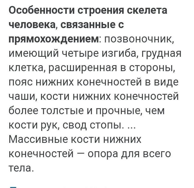позвоночник имеет изгибы грудная клетка расширена в стороны тазовый пояс широкий, имеет вид чаши массивные кости нижних конечностей толще и прочнее костей рук стопа сводчатая