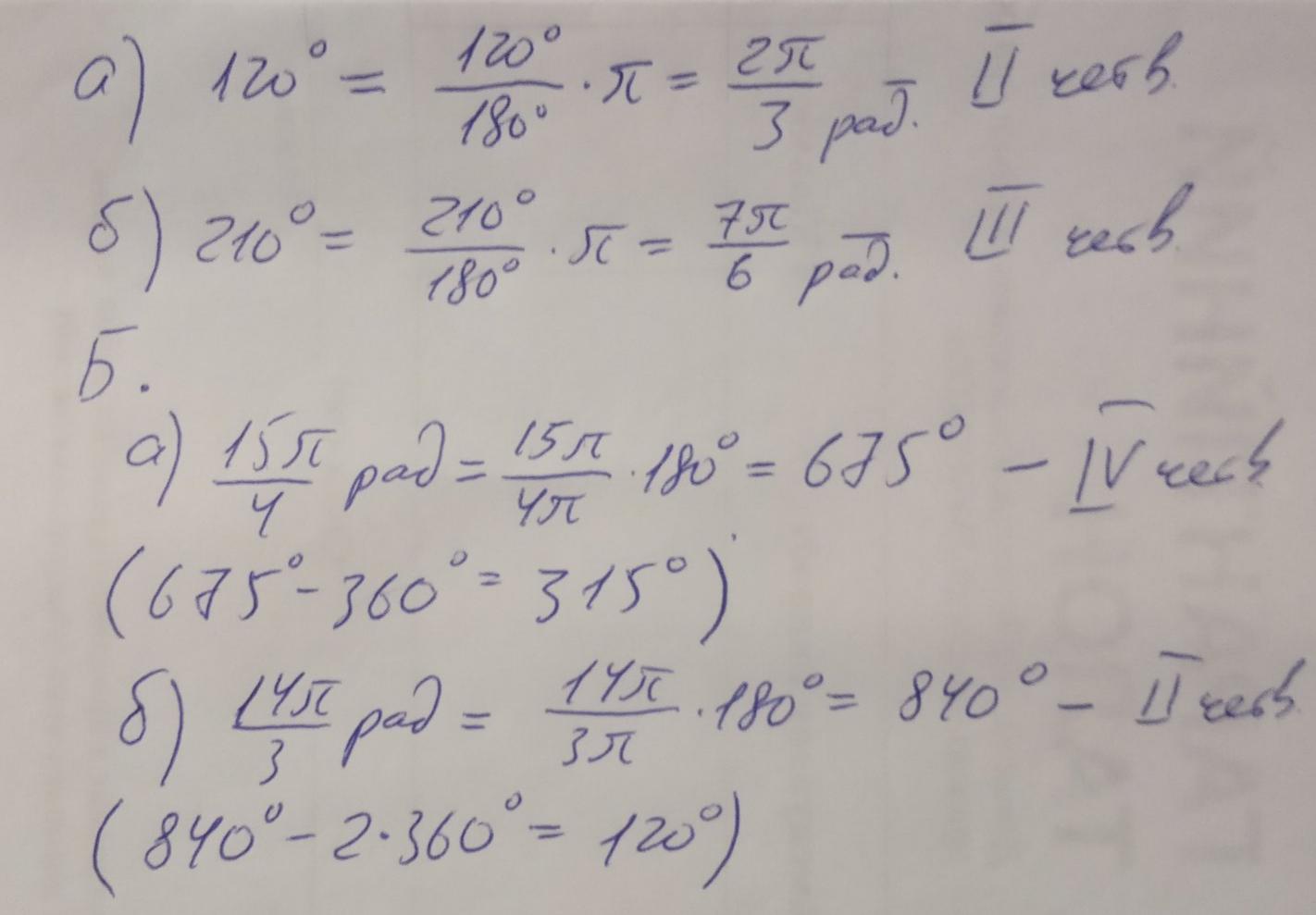 Найдите радианную меру углов и укажите четверть: a) 120° в) 210° Б) Найдите градусную меру углов и укажите четверть: а)15п/4 14п/3