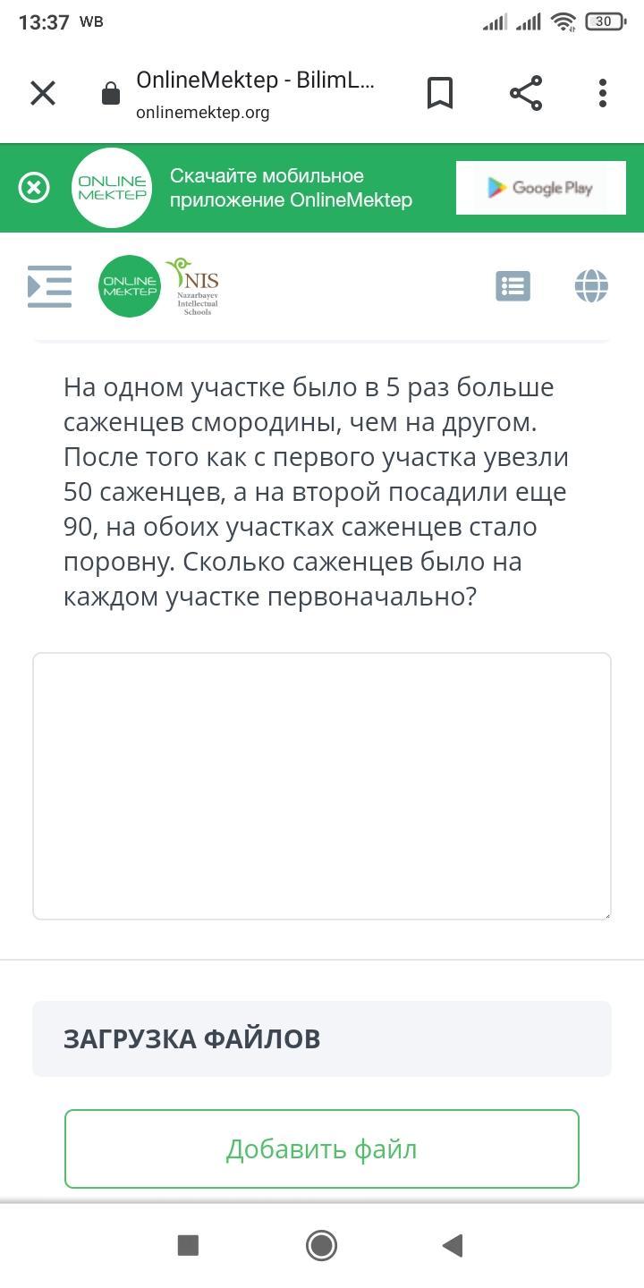 Пусть на втором участке было х саженцев смородины, тогда на первом участке было 5х саженцев. После того, как с первого участка увезли 50 саженцев, то на нем стало (5х – 50) саженцев. А когда на втором участке посадили еще 90 саженцев, то на нем стало (х + 90) саженцев. После этого на обоих участках саженцев смородины стало одинаковое количество. Составим уравнение и решим его.