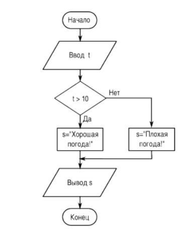 выдачи текста «Хорошая погода!», если t>10 градусов и текста «Плохая