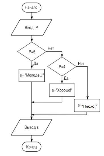 выдачи текста «Молодец!», если P=5, «Хорошо!», если P=4 и «Плохо(», если