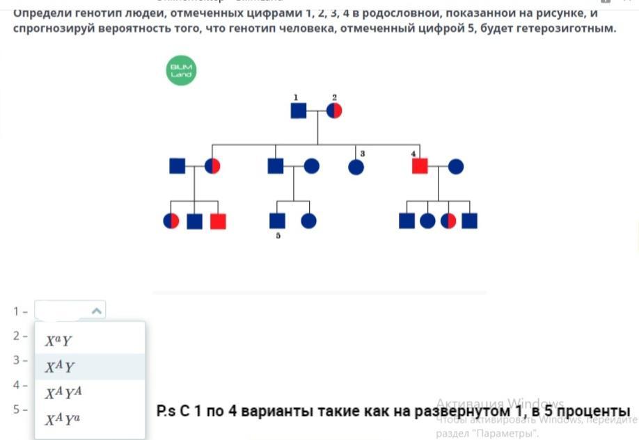 Помогите с биологией! Определи генотип людей, отмеченных цифрами 1, 2, 3, 4 в родословной, показанной на рисунке, и спрогнозируй вероятность того, что генотип человека, отмеченный цифрой 5, будет гетерозиготным.