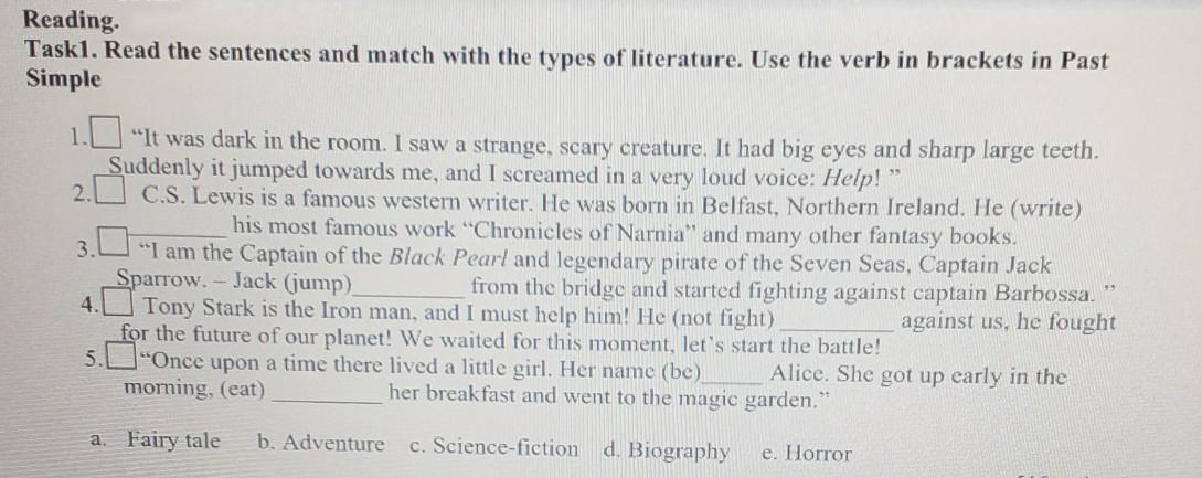 Task1. Read the sentences and match with the types of literature. Use the verb in brackets in Past
