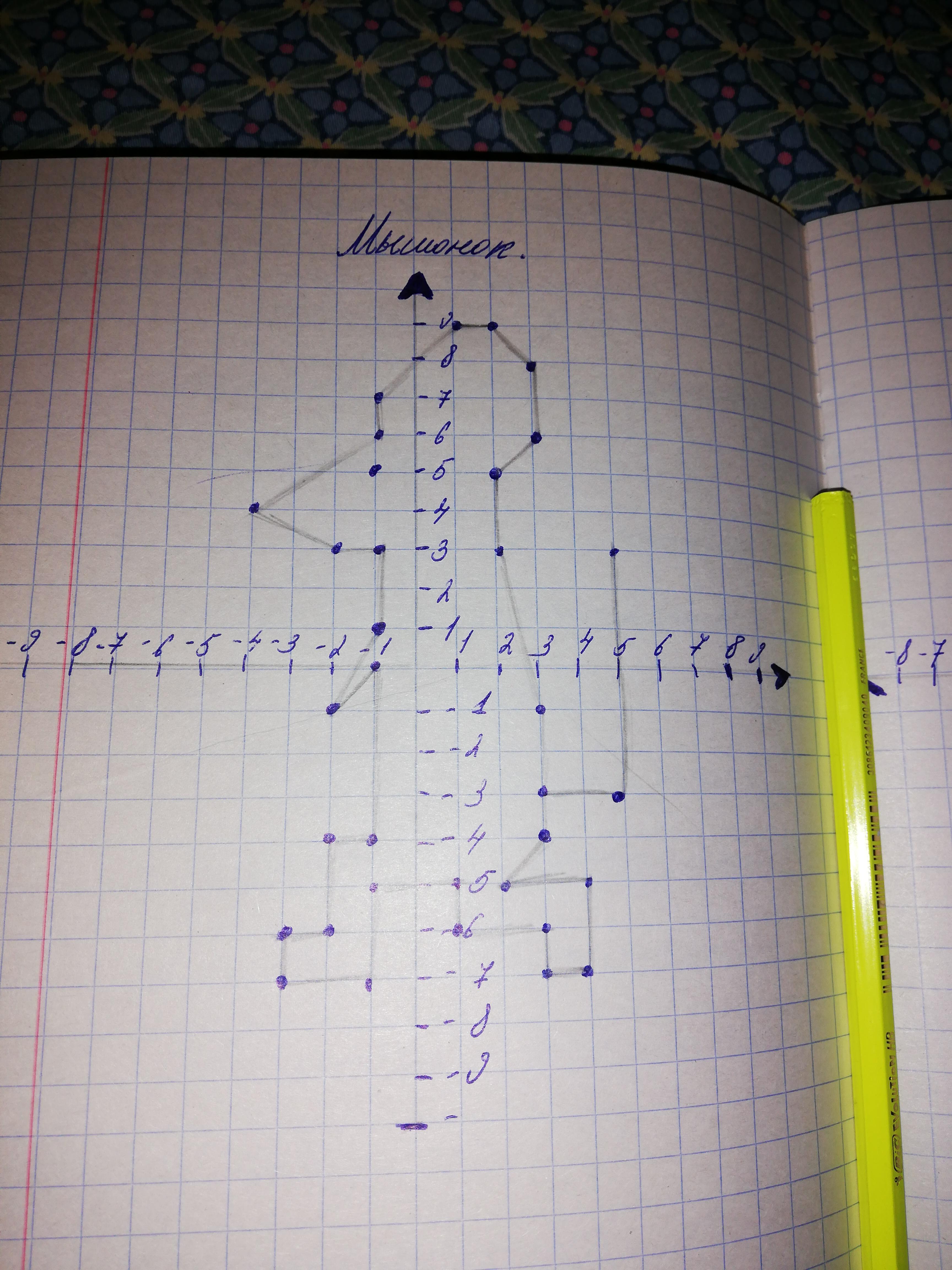 Постройте фигуры по заданным точкам Мышонок 1) (3; - 4), (3; - 1), (2; 3), (2; 5), (3; 6), (3; 8), (2; 9), (1; 9), (- 1; 7), (- 1; 6),(- 4; 4), (- 2; 3), (- 1; 3), (- 1; 1), (- 2; 1), (-2; - 1), (- 1; 0), (- 1; - 4), (- 2; - 4), (- 2; - 6), (- 3; - 6), (- 3; - 7), (- 1; - 7), (- 1; - 5), (1; - 5), (1; - 6), (3; - 6), (3; - 7), (4; - 7), (4; - 5), (2; - 5), (3; - 4). 2) Хвост: (3; - 3), (5; - 3), (5; 3). 3) Глаз: (- 1; 5).