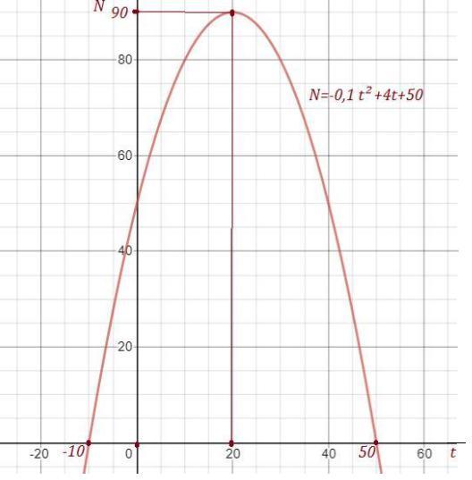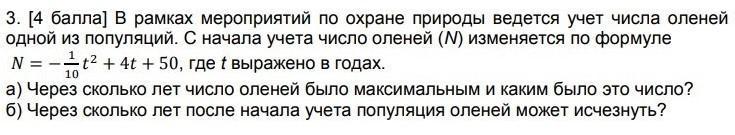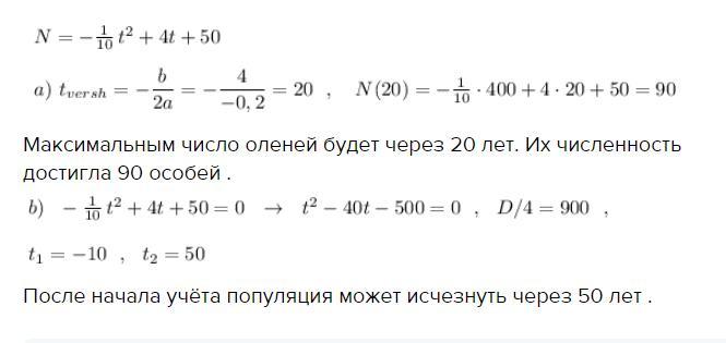 В рамках мероприятий по охране природы ведется учет числа оленей одной из популяций. с начала учета число оленей (n) изменяется по формуле N = - 1/10 t2 + 4t + 50, где t выражено в годах. А. через сколько лет число оленей было максимальным и каким было это число? Б. через сколько лет после начала учета популяция оленей может исчезнуть?