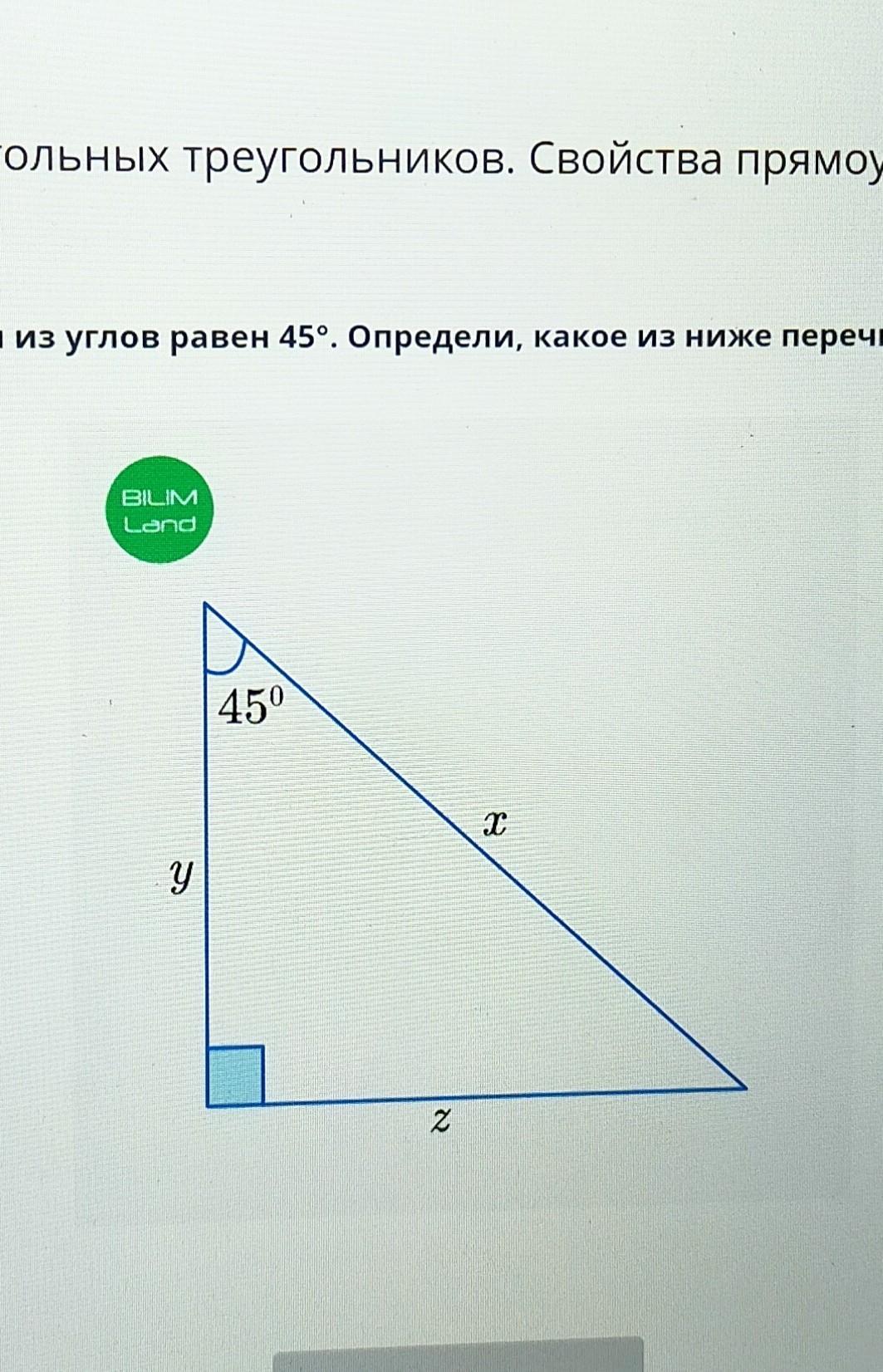 В прямоугольном треугольнике один из углов равен 45°. Определи, какое из ниже перечисленных равенств выполняется для