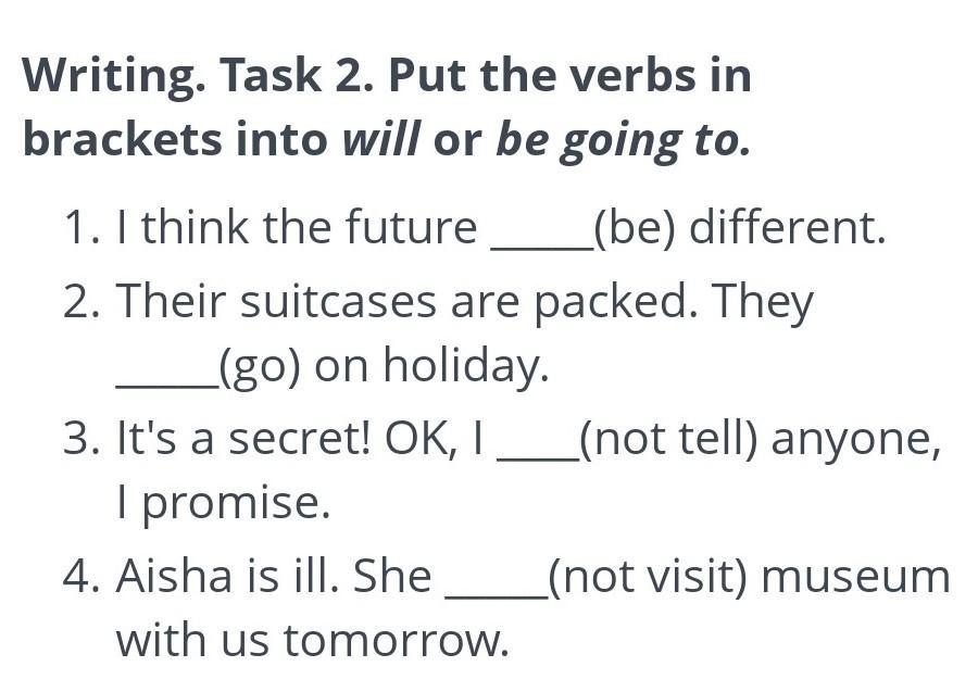 Writing. Task 2. Put the verbs in brackets into will or be going to. Помогите пжпжпжп