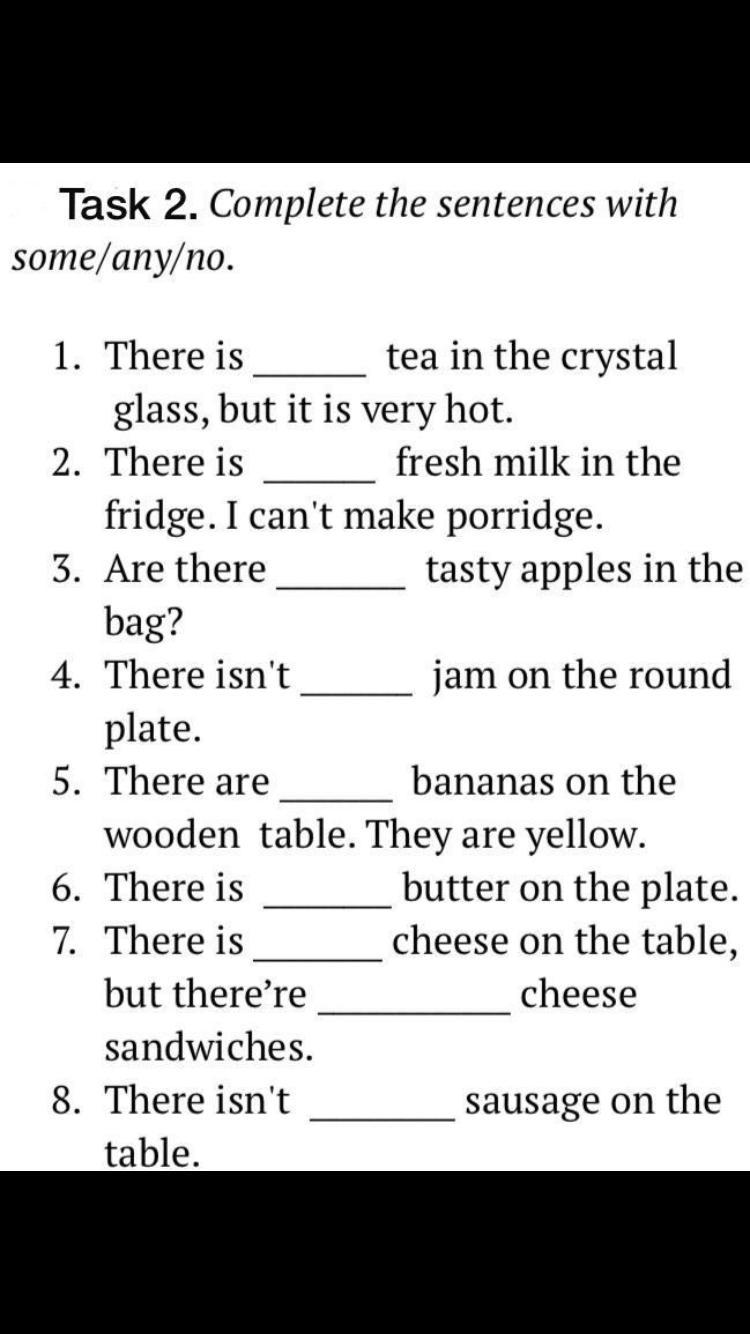 Task 2. Complete the sentences with some/any/no. tea in the crystal 1. There is glass, but it is very hot. 2. There is fresh milk in the fridge. I can't make porridge. 3. Are there tasty apples in the bag? 4. There isn't jam on the round plate. 5. There are bananas on the wooden table. They are yellow. butter on the plate. cheese on the table, 6. There is 7. There is but there're cheese sandwiches. 8. There isn't sausage on the table.